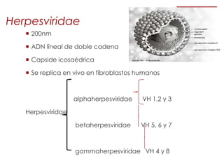 El documento describe el citomegalovirus humano (herpesvirus 5), uno de los herpesvirus más comunes que causa infección congénita. Se replica en células epiteliales, macrófagos, linfocitos y otras células, estableciendo latencia en linfocitos T, macrófagos y otras células. Se transmite a través de la sangre, el tejido y la mayoría de las secreciones corporales.
