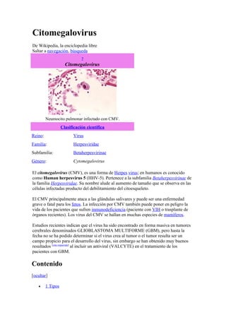La infección por citomegalovirus (CMV) es muy común y afecta entre el 50% y 85% de los adultos en los Estados Unidos. El CMV pertenece a la familia de los virus del herpes y puede causar una enfermedad grave en recién nacidos, personas con sistemas inmunitarios debilitados, y receptores de trasplantes. El CMV generalmente no causa síntomas en personas sanas pero puede permanecer latente de por vida. No existe una vacuna para el CMV pero las infecciones graves pueden tratarse con medicamentos antiv