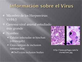 El Cytomegalovirus (CMV) es un virus del grupo de los herpesvirus que infecta principalmente a las células y causa citomegalia. Se transmite a través de fluidos corporales e infecta al 50-60% de las personas durante su vida. La infección congénita por CMV ocurre cuando una mujer embarazada contrae el virus y se lo transmite al feto a través de la placenta, siendo la infección viral congénita más común en los Estados Unidos. Los bebés infectados congénitamente pueden nacer con síntomas como ic