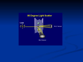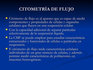 Este documento describe la citometría de flujo, una técnica que permite medir las propiedades de células individuales en suspensión mediante el paso de una corriente de células marcadas con fluorocromos a través de un láser. Proporciona información sobre el tamaño, complejidad y marcadores de las células a través de la luz dispersada y fluorescencia emitida. Se utiliza en aplicaciones biomédicas como hematología, inmunología y oncología. El citómetro de flujo consta de sistemas ó