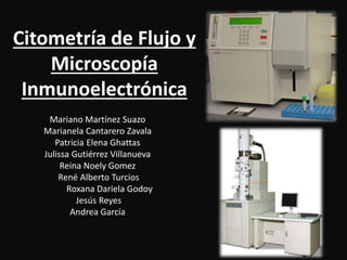 Este documento describe dos técnicas de microscopía: citometría de flujo y microscopía electrónica de barrido. La citometría de flujo permite medir múltiples parámetros de células individuales marcadas con fluorocromos usando láseres y detección de fluorescencia. La microscopía electrónica de barrido usa un haz de electrones en lugar de luz para producir imágenes de alta resolución de la superficie de una muestra, revelando detalles a escala nanométrica. Amb