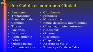 El citoplasma, conocido también como hialoplasma, es una sustancia coloidal compuesta principalmente de agua y partículas que constituye la matriz celular, donde se encuentran los organelos. Este material tiene funciones vitales en la célula, incluyendo el soporte estructural y la realización de procesos metabólicos. El documento también aborda el espacio intersticial, que es el líquido que llena el espacio entre las células y puede verse afectado por diversas enfermedades.