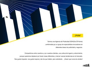La agencia de publicidad City Media se especializa en publicidad exterior innovadora, ofreciendo espacios publicitarios en vehiculares y áreas transitadas de la ciudad, con un enfoque en crear experiencias memorables que impacten a la audiencia. Ofrecen una variedad de formatos publicitarios y utilizan creatividad y tecnología para desarrollar espectáculos que capturan la atención del público. Además, proporcionan consultoría personalizada para adaptarse a las necesidades de cada campaña publicitaria.