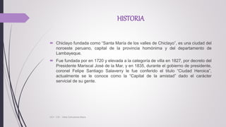 Chiclayo fue fundada en 1720 y elevada a la categoría de villa en 1827. Ubicada al norte de Perú, la ciudad tiene un clima cálido y cuenta con bailes típicos como la marinera norteña, el vals y el baile del tondero. Entre los platos típicos se encuentran el arroz con pato a la chiclayana, el chiringuito y el cabrito a la chiclayana, mientras que lugares turísticos importantes son el Museo Nacional de Sicán, las Tumbas Reales de Sipán