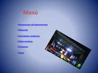 Este documento proporciona información sobre la ciudad de Itá, Paraguay. Se encuentra a 37 km de Asunción y tiene una población de 81,084 habitantes. Algunas actividades y sitios destacados son la agricultura, alfarería, turismo de aventura en Arruaí, museos como el Museo Ñande Ypycué, y atracciones naturales como la laguna de Itá e iglesias históricas. El documento incluye detalles de contacto de la municipalidad local y opciones de transporte para visitar esta ciudad, conoc
