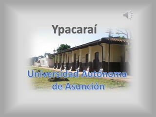 El documento presenta información sobre Ypacaraí, una ciudad ubicada cerca del lago Ypacaraí en Paraguay. Fue fundada en 1887 y su economía se basa principalmente en la agricultura y la artesanía. La ciudad cuenta con varios sitios turísticos como la Iglesia Sagrado Corazón de Jesús, el Museo Memoria Ypacaraiense y el mausoleo donde descansan los restos de Teodoro S. Mongelós y Demetrio Ortiz.