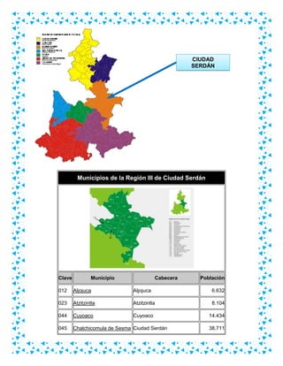 La región III de Ciudad Serdán está conformada por 18 municipios. Tuvo un auge después de la conquista española al ser una importante ruta comercial. Actualmente su economía se basa en la agricultura, especialmente de papa, maíz, frijol y girasol, e industrias alimenticias y de cuero. Algunos platillos típicos son el chileatole, tlaxcales y mole poblano.