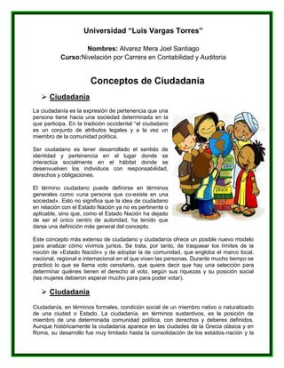 El documento define la ciudadanía como la pertenencia de una persona a una sociedad determinada, conllevando responsabilidades, derechos y deberes. Explica que originalmente la ciudadanía se refería a la pertenencia a una ciudad, pero con el surgimiento de los estados-nación pasó a definirse en relación a un estado. Asimismo, señala que históricamente la ciudadanía tenía límites y no todos los grupos sociales tenían acceso a ella, aunque los sistemas democráticos la conciben como la base de la inclusión de