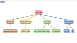 El documento aborda el concepto de ciudadanía digital, que implica el acceso y uso crítico de tecnologías de la información y la comunicación para ejercer derechos y responsabilidades en el entorno digital. Se enfatiza la importancia de la educación en habilidades digitales en instituciones académicas para preparar a los estudiantes como prosumidores seguros y responsables. Además, se presentan diversas temáticas y desafíos que los docentes deben enfrentar en la enseñanza de la ciudadanía digital.
