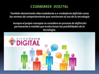 La ciudadanía digital se refiere a las normas de comportamiento para el uso de la tecnología. Tiene como objetivo capacitar a los colombianos en competencias digitales para que puedan usar la tecnología de manera productiva. La identidad digital incluye la información sobre una persona publicada en internet, como datos personales e imágenes.