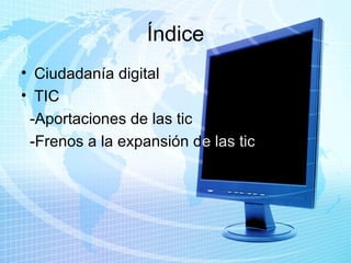 Este documento trata sobre la ciudadanía digital y las tecnologías de la información y la comunicación (TIC). Define la ciudadanía digital como la aplicación de los derechos humanos y derechos de ciudadanía a la sociedad de la información. Las TIC incluyen servicios, redes, software y dispositivos que mejoran la calidad de vida a través de un sistema de información interconectado. Las TIC aportan fácil acceso a información, procesamiento rápido de datos, comunicación inmediata y capacidad de almacenamiento. Sin embargo,