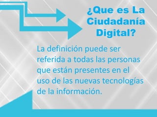 La ciudadanía digital se refiere a las normas de comportamiento para el uso de la tecnología y comprende asuntos relacionados con el uso de las TIC. Un ciudadano digital tiene derecho al acceso a las TIC y a desarrollar habilidades digitales. Sus derechos incluyen el acceso seguro y privado a la información en línea y la participación a través de medios tecnológicos. Algunas áreas clave son la educación, el acceso y la participación, que incluyen la brecha digital y el ejercicio responsable.
