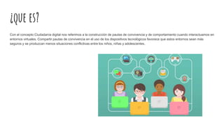El documento habla sobre la ciudadanía digital y lo que implica. Explica que la ciudadanía digital se refiere a las pautas de comportamiento para interactuar en entornos virtuales. Todos los actores sociales, incluyendo al estado, escuelas y familias, son responsables de asegurar que los niños gocen de sus derechos como ciudadanos digitales. Un usuario seguro y responsable es aquel que usa los dispositivos de forma segura, controla sus emociones cuando interactúa en línea, y se hace responsable por sus propias acciones.