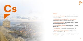 Este documento presenta el programa electoral de Ciudadanos para las elecciones municipales de Alicante en 2019. Propone siete áreas principales de acción: 1) mejorar la eficiencia de los servicios municipales, 2) aumentar la transparencia y participación ciudadana, 3) dinamizar la economía local, 4) reforzar las políticas sociales, 5) aplicar innovaciones tecnológicas, 6) modernizar la ciudad, y 7) potenciar la cultura. Dentro de cada área, se detallan varias propuestas concretas para mejorar la gest