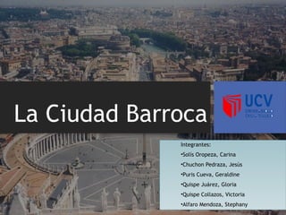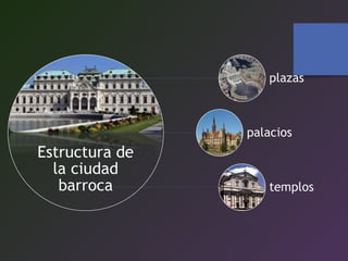El documento presenta información sobre la ciudad barroca, incluyendo sus características principales como el trazado ortogonal, la ostentación para reflejar el poder, y la creación de la ciudad como obra de arte visual. También describe ejemplos específicos de plazas y edificios barrocos como la Plaza Mayor de Madrid, la Plaza Mayor de Salamanca, y la fachada de San Pedro.