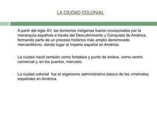 La ciudad colonial surgió a partir del siglo XV como centros administrativos de los territorios conquistados por los españoles en América. Estaban organizadas en torno a una plaza central con estructuras como la catedral, el cabildo y edificios militares. Se caracterizaban por su trazado en damero con calles rectas y manzanas cuadradas para facilitar la defensa militar y aprovechar los vientos.