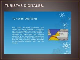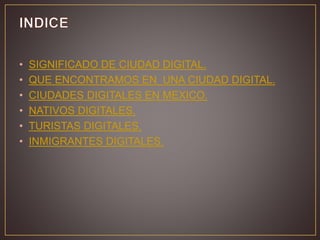 Este documento define una ciudad digital y describe sus características clave. Una ciudad digital es una comunidad avanzada donde los ciudadanos interactúan y acceden a servicios a través de la tecnología. Una ciudad digital busca poner la mejor tecnología al servicio de los ciudadanos. Algunas ciudades digitales en México incluyen la Ciudad de México, Culiacán y Chihuahua. El documento también discute nativos digitales, turistas digitales e inmigrantes digitales y cómo cada grupo interactúa con la tecnología.
