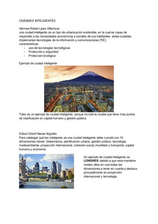 3. Ejemplos de ciudades inteligentes son Barcelona, Zurich y Singapur.