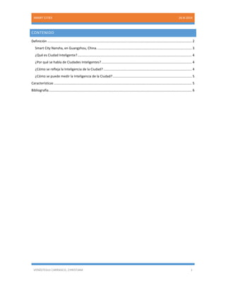Una ciudad inteligente se define como aquella en la que la inversión social, el capital humano, las comunicaciones y la infraestructura existen en armonía con un desarrollo económico sostenible, apoyándose en el uso de nuevas tecnologías para mejorar la calidad de vida y gestionar los recursos de forma sostenible. Una ciudad puede medir su inteligencia a través del índice CSI que evalúa aspectos como educación, salud, transporte y seguridad mejorados con soluciones TIC. Las características clave de