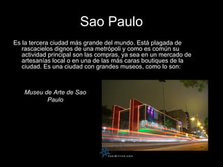 Este documento describe las principales ciudades de Brasil, incluyendo Sao Paulo, la tercera ciudad más grande del mundo conocida por sus rascacielos, museos y vida cultural vibrante; Río de Janeiro, famosa por monumentos como Cristo Redentor y zonas turísticas; Belo Horizonte, estable económica y socialmente con excelente infraestructura; y Brasilia, la capital moderna diseñada en forma de flecha y arco con lugares como el Palacio de la Alvorada y el Lago Paranoá.