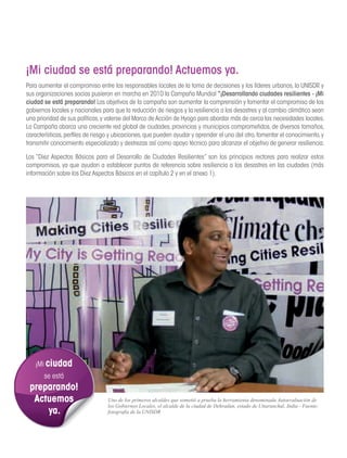 Este documento presenta un manual para líderes de gobiernos locales sobre cómo desarrollar ciudades más resilientes. El manual describe 10 aspectos esenciales para lograr ciudades resilientes, incluyendo establecer marcos institucionales, evaluar riesgos multi-amenazas, proteger la infraestructura e instalaciones vitales, educar al público, y asegurar una recuperación efectiva después de desastres. El objetivo es ayudar a líderes locales a incorporar la reducción de riesgos de desastres en sus políticas y planes de