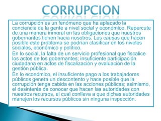 La corrupción afecta negativamente las obligaciones de los gobernantes hacia el pueblo en los niveles social, económico y político. Socialmente, hay falta de fiscalización de los actos de los gobernantes y poca participación ciudadana. Económicamente, los bajos salarios de los trabajadores públicos generan descontento y permiten la corrupción, así como el desinterés del público en saber cómo se usan los recursos. Políticamente, la mala aplicación de la justicia, la pérdida de valores y el favoritismo generan