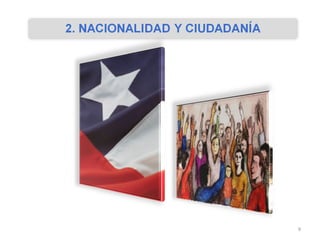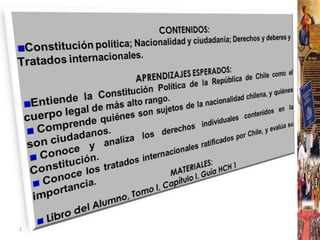 La Constitución Política es la ley fundamental de Chile y establece los principios y organización del Estado, así como los derechos fundamentales de las personas. Asegura una serie de derechos civiles, políticos, económicos y sociales. Chile ha firmado tratados internacionales sobre derechos humanos que regulan su actuación interna e internacional. La educación es un derecho garantizado por la Constitución.
