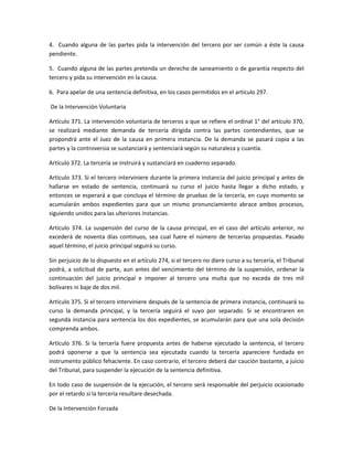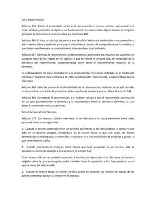 Este documento describe los procedimientos legales relacionados con la reconvención, la intervención de terceros y la fase de instrucción en un juicio civil en Venezuela. En particular, establece las reglas para (1) la presentación de una reconvención por el demandado, (2) los diferentes tipos de intervención de terceros en un caso, ya sea voluntaria u obligatoria, y (3) los pasos del proceso probatorio, incluidos los plazos para la promoción y evacuación de pruebas.