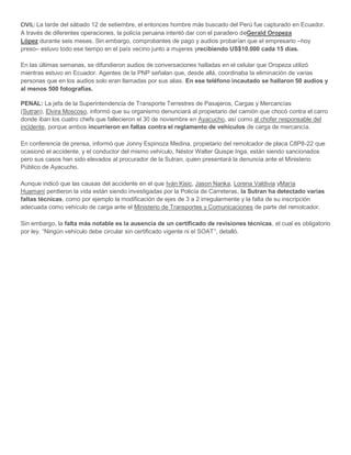 Gerald Oropeza López, el hombre más buscado del Perú, fue capturado en Ecuador donde estuvo escondido durante seis meses recibiendo pagos y coordinando ataques contra otras personas. La jefa de la Sutran informó que denunciarán al propietario y chofer de un camión que chocó contra un auto matando a cuatro chefs, ya que incurrieron en varias faltas como modificar el vehículo de forma irregular y circular sin los certificados obligatorios. También están investigando las causas del accidente.