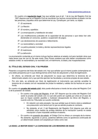 Este documento resume los conceptos clave de la capacidad jurídica y la capacidad de obrar. Explica que la capacidad jurídica es un atributo de la personalidad que puede restringirse para algunos sujetos, mientras que la capacidad de obrar depende de la inteligencia y voluntad. También analiza las incapacidades, limitaciones y prohibiciones a la capacidad, así como los conceptos de estado civil, título del estado civil, edad y capacidad de los menores.
