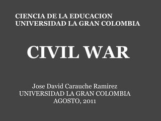 El documento resume la historia de la Guerra Civil entre los superhéroes Iron Man y Capitán América. Comenzó con una ley de registro de superhéroes que Iron Man apoyaba y Capitán América se oponía, lo que llevó a una guerra entre ellos. A medida que la batalla continuaba, más superhéroes y villanos eligieron bandos. Finalmente, solo Iron Man y Capitán América permanecieron. Aunque Capitán América ganó la batalla final, la guerra terminó cuando el público apoyó