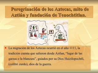 El documento resume la historia de la civilización azteca. Los aztecas emigraron de Aztlán en 1111 guiados por su dios Huitzilopochtli en busca de un lugar donde encontrarían un águila posada sobre un nopal devorando una serpiente. En 1325 encontraron este sitio y fundaron la ciudad de Tenochtitlán en el lago de Texcoco. Los aztecas eran politeístas y creían en dioses como Tlaloc, dios de la lluvia, y Huitzilopochtli, dios de la guerra.