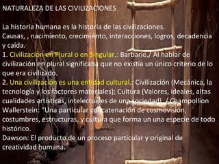 El documento describe las características principales de las civilizaciones y enumera varias civilizaciones existentes. Define una civilización como una entidad cultural global con elementos como lengua, religión e historia en común. Explica que las civilizaciones son dinámicas, pueden interactuar entre sí e influenciarse mutuamente, y eventualmente declinar. Menciona doce civilizaciones principales a lo largo de la historia, incluidas las civilizaciones China, India, Islámica, Occidental y otras.