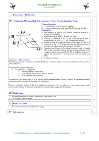 La sesión de entrenamiento se centra en mejorar la defensa 1 contra 1 mediante ejercicios progresivos. Primero, los jugadores participan en un calentamiento que involucra persecuciones para desarrollar la toma de decisiones bajo presión. Luego practican técnicas defensivas individuales enfrentándose uno a uno y finalizando la jugada. Más tarde, realizan una rueda de tiros para mejorar la defensa individual, los centros y los disparos a portería. La sesión concluye con un mini partido para aplicar lo