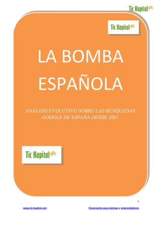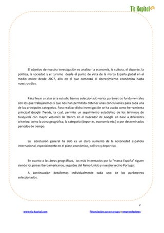 Este documento analiza las tendencias de búsqueda en Google de términos relacionados con la economía, cultura, deporte, política y sociedad de España desde 2007 hasta la actualidad. Utilizando Google Trends, examina las búsquedas de las principales empresas, deportes y figuras públicas españolas, y encuentra que la notoriedad de España ha aumentado especialmente en las áreas económica, política y deportiva. Los países con mayor interés en la "marca España" continúan siendo los iberoamericanos, seguidos del Reino Unido y