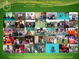 Este documento presenta la información del Colegio Libertadores de América, incluyendo su misión, visión, perfil de egresado, departamentos, talleres, laboratorios, servicios, ubicación y costos. El colegio ofrece educación de calidad a nivel secundaria y bachillerato con el objetivo de desarrollar conocimientos y habilidades en los estudiantes.