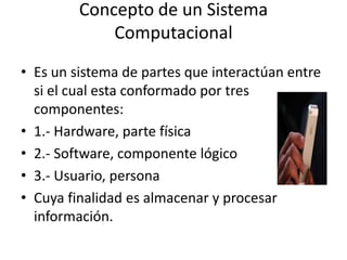 Este documento describe los componentes básicos de un sistema computacional, incluyendo el hardware, software y usuario. Explica que el hardware se compone de dispositivos de entrada, salida y almacenamiento, mientras que el software incluye aplicaciones como procesadores de texto y hojas de cálculo, así como sistemas operativos. El objetivo final de un sistema computacional es almacenar y procesar información de manera que pueda ser utilizada por el usuario.