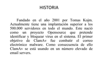 ClamAV es un software antivirus de código abierto fundado en 2001. Se usa principalmente en servidores de correo electrónico para identificar y bloquear malware, virus y troyanos. Está licenciado bajo GPL y es compatible con sistemas operativos como Linux, Windows y Unix. Actualmente tiene presencia en más de 500,000 servidores a nivel mundial.