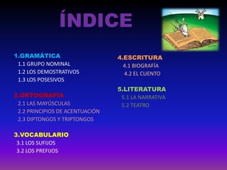 Este documento proporciona una introducción a varios temas relacionados con el lenguaje. Incluye secciones sobre gramática, ortografía, vocabulario, escritura y literatura. Resume conceptos clave como los grupos nominales, los demostrativos, los posesivos, las mayúsculas, los acentos, los sufijos y prefijos, los géneros narrativos como el cuento y la novela, y los géneros teatrales como la comedia y la tragedia.