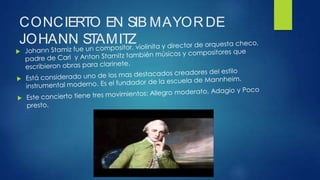 El documento presenta resúmenes de varias obras para clarinete de diferentes compositores como Mozart, Mercadante, Paganini, Weber, Mendelssohn, Schumann, Brahms, Debussy, Poulenc, Khachaturian, Penderecki, Copland y otros. Incluye detalles sobre los compositores, la forma musical y aspectos que le gustaron al alumno de cada pieza.
