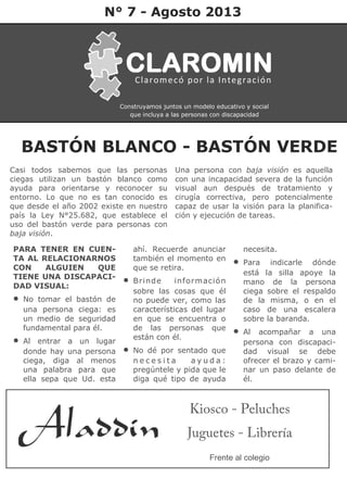 El documento habla sobre la inclusión de personas con discapacidad en la educación y la sociedad. Recomienda tratar a las personas con discapacidad visual con respeto y no dar por sentado que necesitan ayuda sin antes preguntar. También explica que las personas con baja visión usan un bastón verde para orientarse.