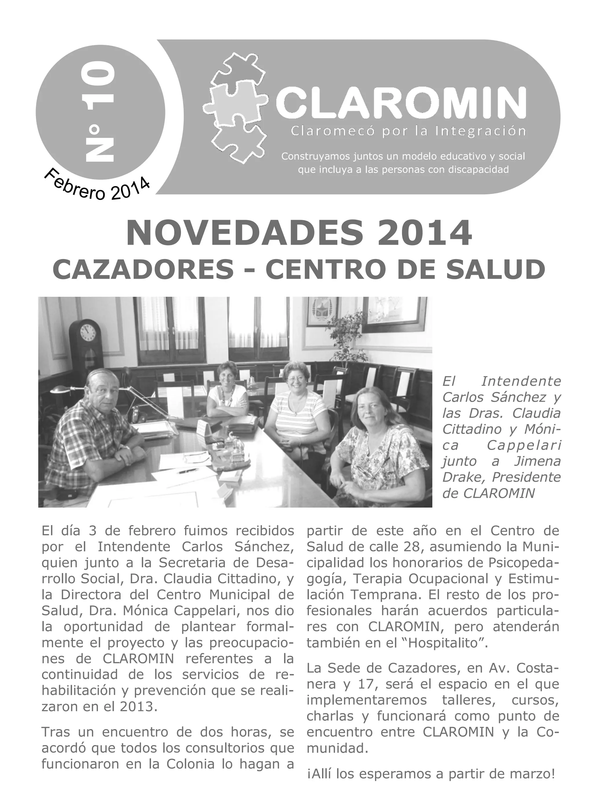 El documento resume una reunión entre representantes de CLAROMIN y funcionarios municipales de Tres Arroyos. Se acordó que los servicios de rehabilitación que se ofrecieron en 2013 en la Colonia continuarán ofreciéndose en el Centro de Salud, y que la sede de Cazadores albergará talleres y será un punto de encuentro. CLAROMIN busca más oportunidades de inclusión.