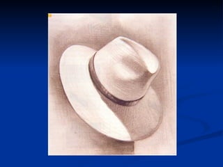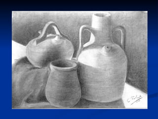 Este documento describe los principios básicos del claroscuro y cómo se crea volumen a través del juego de luces y sombras. Explica que los objetos se distinguen del fondo cuando son iluminados debido a su relieve, y que todas las superficies tienen zonas de sombra y luz proyectada. Además, describe diferentes técnicas como el sombreado, la grisalla y el uso de manchas para crear claroscuro en dibujos.