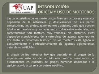 El documento describe los diferentes tipos de morteros y sus usos. Los morteros se componen principalmente de áridos, aglomerantes y aditivos. Sus características dependen de los materiales utilizados pero principalmente del aglomerante. Los morteros se han usado desde los orígenes de la civilización como material de construcción para edificios, defensas y uniones entre materiales.