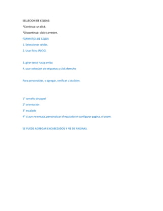 Este documento proporciona instrucciones sobre el uso básico de Excel, incluyendo cómo seleccionar celdas, ingresar datos de texto, números y fechas, y aplicar formatos de celda. También cubre cómo realizar cálculos básicos usando fórmulas con el símbolo "=" y cómo personalizar la configuración de página y agregar encabezados y pies de página.