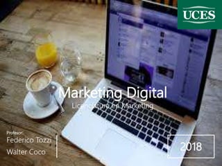 El profesor Federico Tozzi presenta una clase sobre Marketing Digital a estudiantes de la Licenciatura en Marketing. La clase cubrirá la historia del mundo digital, el contexto mundial de Internet y usuarios, la evolución de la publicidad en línea, métricas claves para medir campañas, y tipos de ofertas como CPC, CPA, CPL y CPV. Los estudiantes deben formar equipos de 5 a 7 integrantes y completar un formulario, y podrán acceder al material de la clase a través de un grupo de LinkedIn.