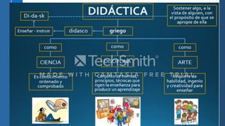 El documento provee una revisión histórica y conceptual de la didáctica. Explica que la didáctica tiene su origen etimológico en términos griegos relacionados a enseñar y que autores como Comenio y Herbart contribuyeron a establecerla como disciplina. Define la didáctica como la ciencia aplicada que tiene por objeto el proceso de enseñanza-aprendizaje y la formación integral del estudiante. Finalmente, señala que la didáctica busca explicar dicho proceso de manera sistemática