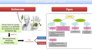 Este documento resume los principales tipos de respuesta inmune, incluyendo la respuesta inmune normal, la hipersensibilidad, la autoinmunidad y la inmunodeficiencia. También describe las diferentes clases de fármacos inmunosupresores y sus mecanismos de acción, como los inhibidores de la expresión génica, los antimetabolitos, los inhibidores de señalización linfocitaria y los inhibidores de citocinas.