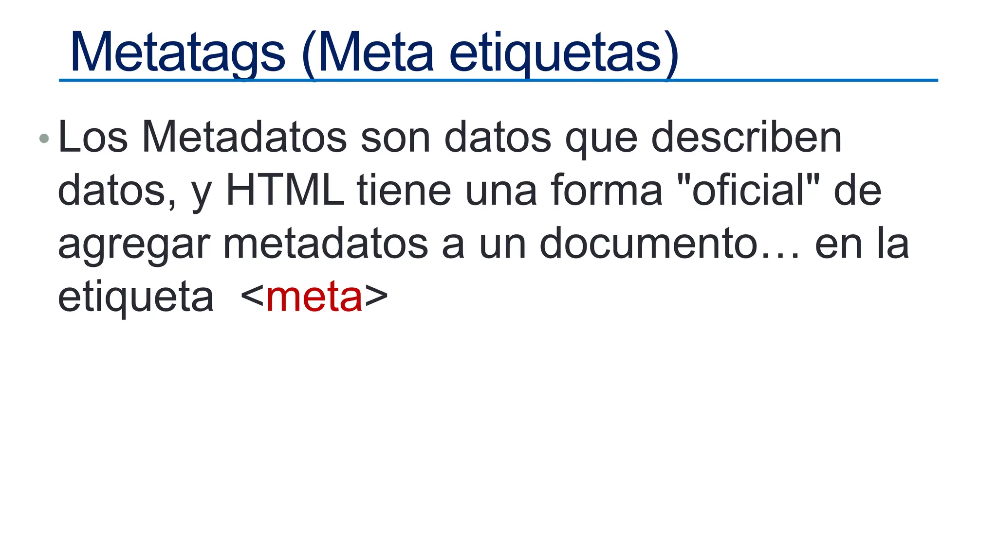 Este documento presenta una clase teórica sobre metadatos y etiquetas meta en HTML. Explica que los metadatos son datos que describen otros datos y que HTML usa la etiqueta <meta> para agregar metadatos a un documento, mencionando los atributos name y content. Luego detalla los metatags más usados como description y author.