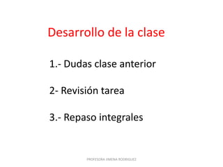 La profesora Jimena Rodríguez impartió una clase sobre integrales elementales. Revisó ejemplos y ejercicios de diferentes tipos de integrales como integrales de funciones racionales, logarítmicas y exponenciales. Asignó 6 tareas a los estudiantes relacionadas con el tema cubierto en clase.